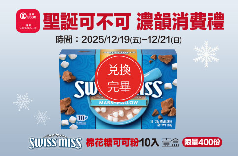 活動內容:活動期間於SOGO百貨新竹店使用APP首頁之會員QRCODE(20084開頭卡號)消費集點,當日單筆滿2,000元(含)以上,即可憑同卡號電子發票及銷貨明細,兌換「SWISS MISS棉花糖可可粉」10入 /壹盒(限量400份)