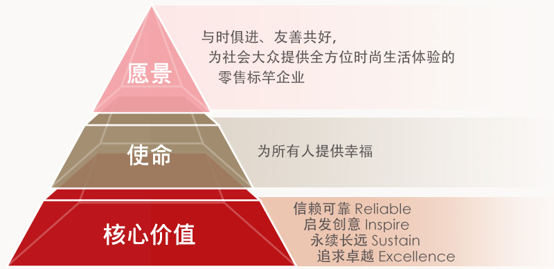 远东SOGO在追求营运与管理绩效的同时,积极推动环境永续、社会共好,以ESG(环境、社会、治理)三大构面巩固EPS(公司创造每股获利),又以EPS挹注ESG,建构一个与所有利害关系人共荣永续的生态系。我们的愿景是成为「与时俱进、友善共好,为社会大众提供全方位时尚生活体验的零售标竿企业」。我们的使命是「为所有人提供幸福」-Bring Happiness to All。我们的核心价值是R.I.S.E.- 四个英文词汇的字首组合:「信赖可靠Reliable」、「启发创意Inspire」、「永续长远Sustain」、「追求卓越Excellence」。